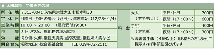 常陸太田市の総合福祉会館は、総合保健センターと社会福祉協議会が併設されたユニークな施設。その中にある日帰り入浴施設が太田温泉『やまぶきの湯』です。